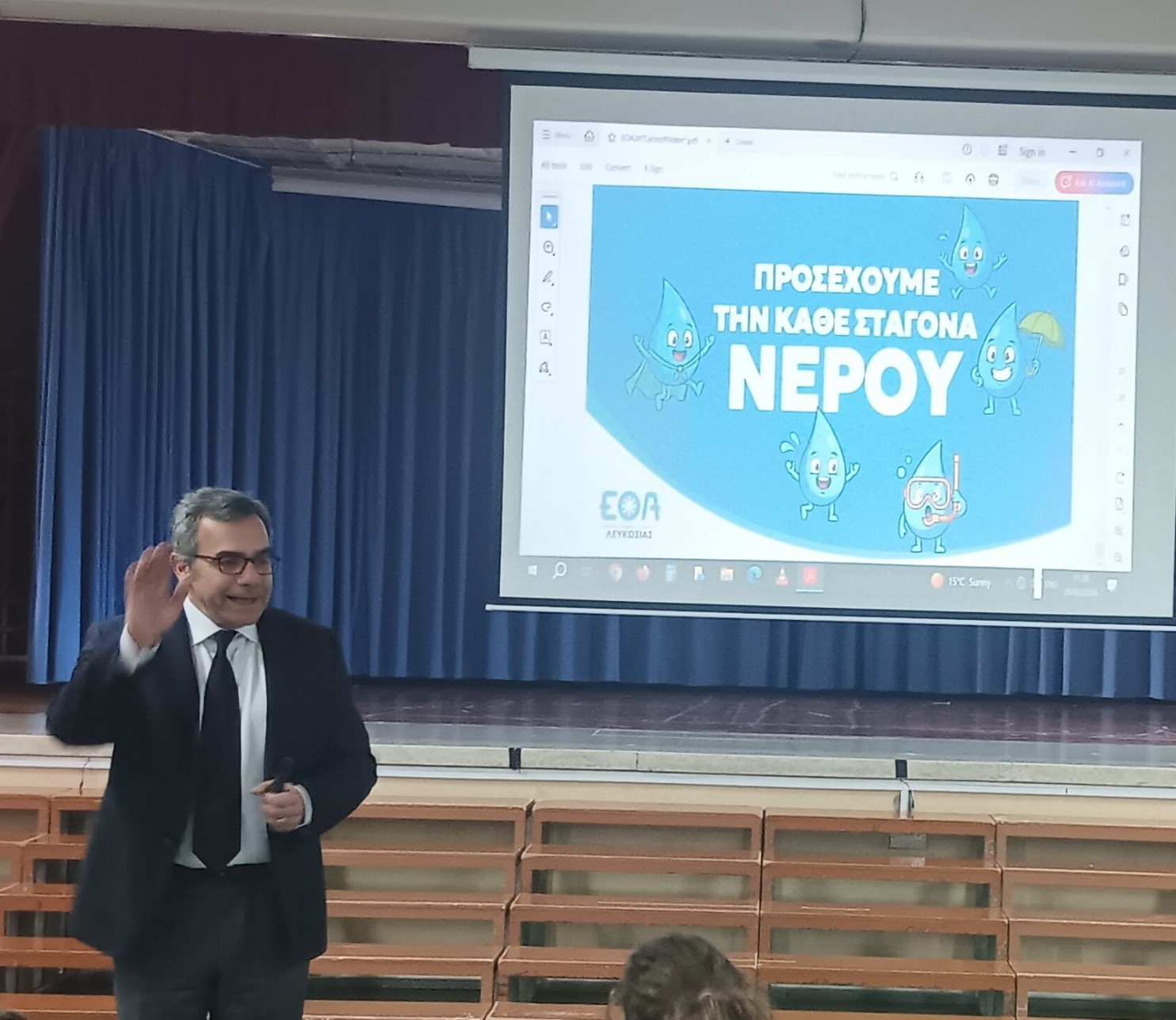 Στις 25 Φεβρουαρίου επισκέφθηκε το σχολείο μας ο πρόεδρος του Επαρχιακού Οργανισμού Αυτοδιοίκησης, κ. Κωνσταντίνος Γιωρκάτζης και μίλησε στα παιδιά των Δ΄ τάξεων για τους τρόπους εξοικονόμησης νερού.
